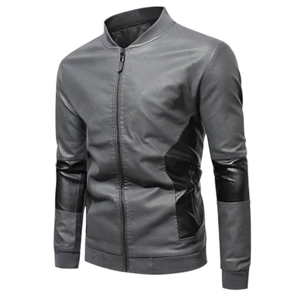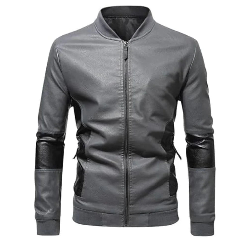 Men's Charcoal Grey Black-Patched Regular-fit Standup-Collar Stylish Genuine Sheepskin Motorcycle Leather Jacket