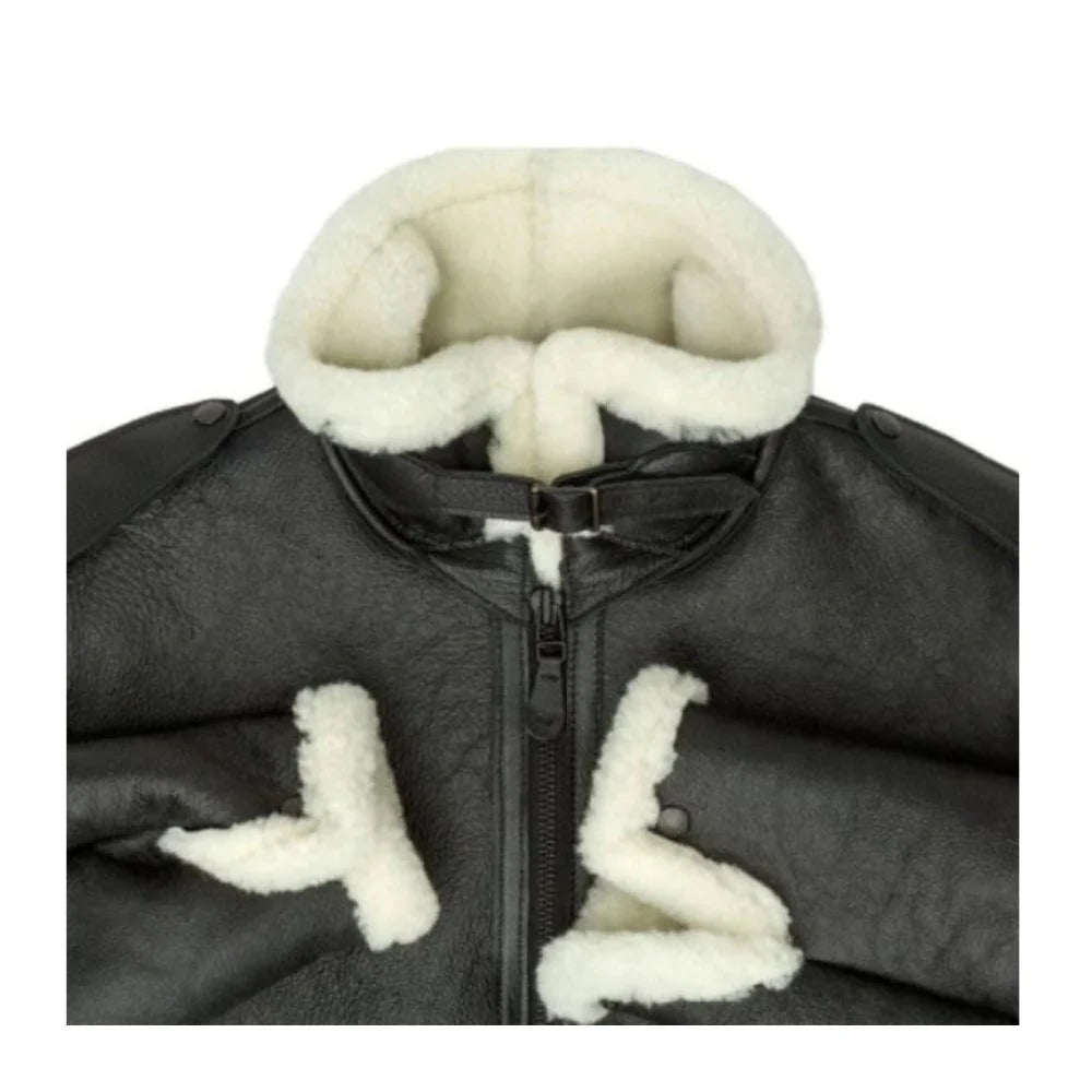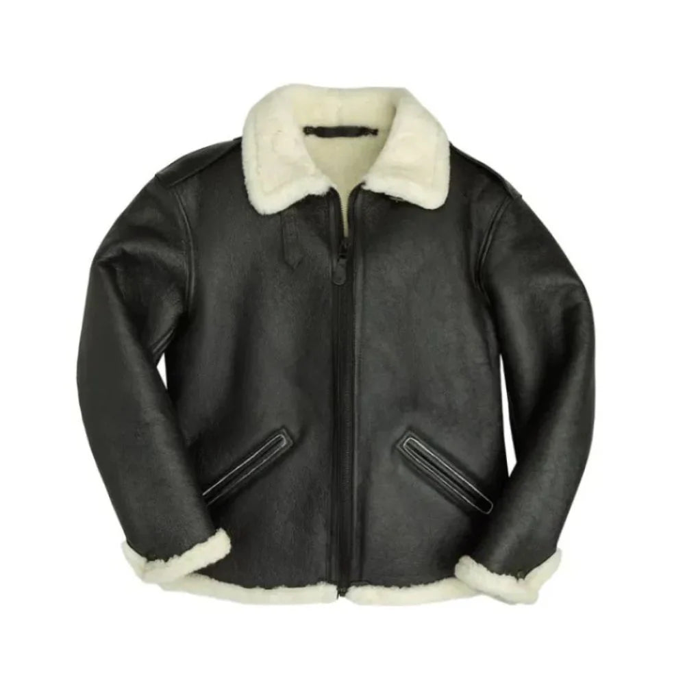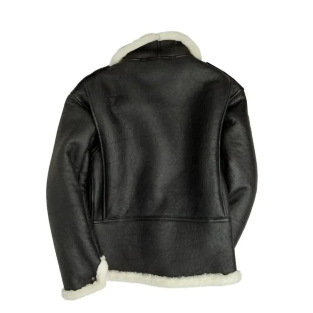 This black flight bomber leather jacket is especially made from genuine sheepskin leather; it serves its purpose in containing warmth and a certain level of luxury. Both its comfort level and style index are improved with the fake shearling collar, cuffs, and hem lining. It has welt pockets and a zipper for closure. The snap tab straps on the jacket's shoulders are another distinctive element that lends it an officer-like appearance. Whether you're wandering around the city center or traveling at high altitudes, this classic jacket will keep you toasty. It will endure for many seasons because to its fine craftsmanship and careful attention to detail.
