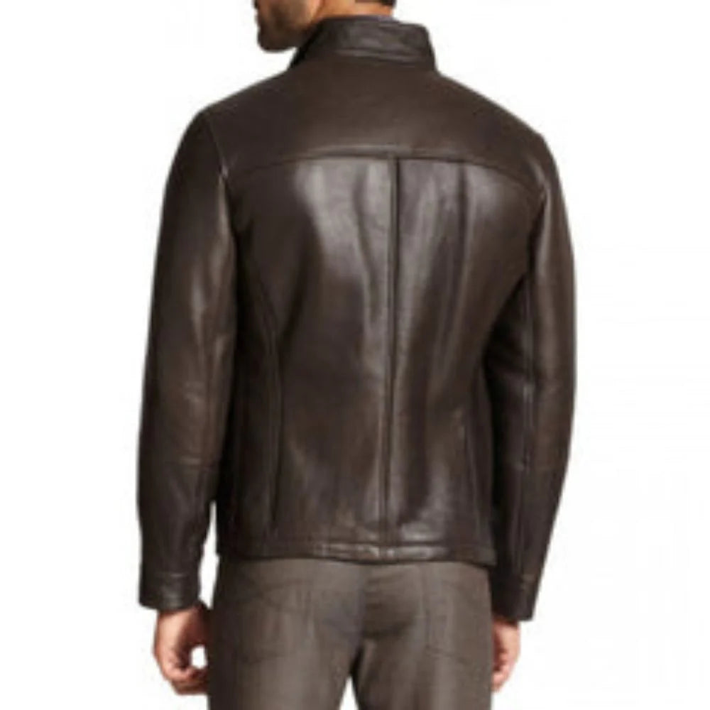The men's deep coffee brown leather jacket is made entirely of lambskin leather, has a classic design, exceptional comfort, and long-lasting quality. A stylish and sophisticated stand-up collar. The sleek, accurate cut guarantees a flattering fit for all body shapes, and the traditional front flap pocket design offers plenty of storage for your possessions. The jacket is simple to put on and take off thanks to its strong zipper.