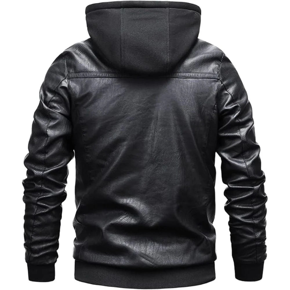 Black sheepskin leather jacket with hood and shearling fur lining for men. The vest itself is quite cozy and toasty. To prevent chilly air from penetrating, there is a zipper and a removable hoodie that is secured snugly with a drawstring. The interior lining features silky faux shearling fur so it delivers good insulation even during chilly conditions. It features a hood drawstring for a customizable fit and a Mandarin collar. The jacket is elastic and fits snugly around the wrist thanks to the ribbed knit pattern on the bottom hem and cuffs. Comfort and longevity in the cuffs' appearance are guaranteed by this design. Your hands stay warm inside the jacket thanks to the two hand pockets on the front side. Overall, it is casual and practical for many occasions.