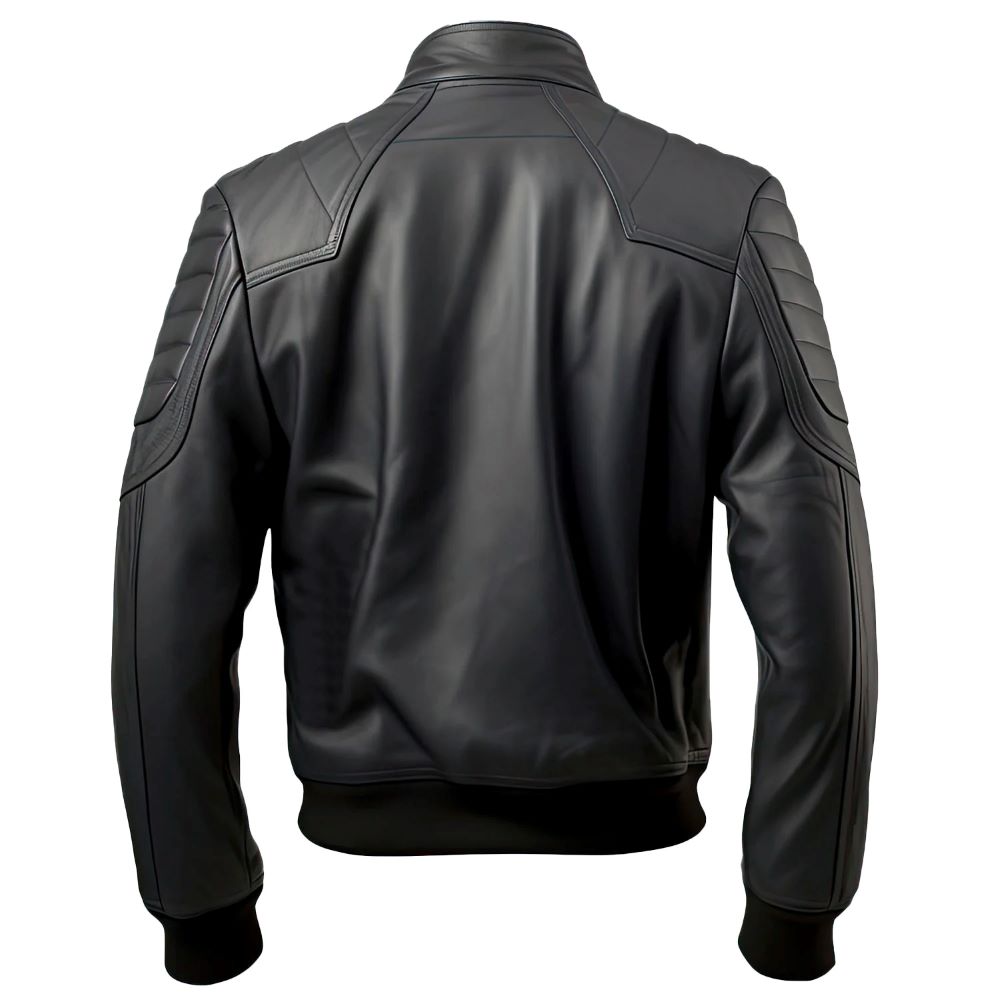 Men's Classic Black Stand-up Collar Zip-up Quilted Shoulders Rib Knit Sporty Lightweight Scooter Style Bomber Leather Jacket