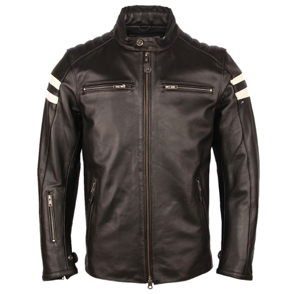 This men's black leather jacket has a classic design. Because it is made of real sheepskin leather, it is long-lasting and of excellent quality. The wearer's neck may be shielded from the chilly breeze by buttoning the high collar. The jacket has two waist pockets, two chest pockets, and a YKK zip fastening. The long sleeves are completed with buttoned cuffs and a zipper. The jacket's back and sleeves include contrasting white stripes that significantly enhance the overall look. This jacket is perfect for a variety of occasions, from informal get-togethers to formal events and outdoor sports. Its warmth makes it appropriate for both formal and informal settings.