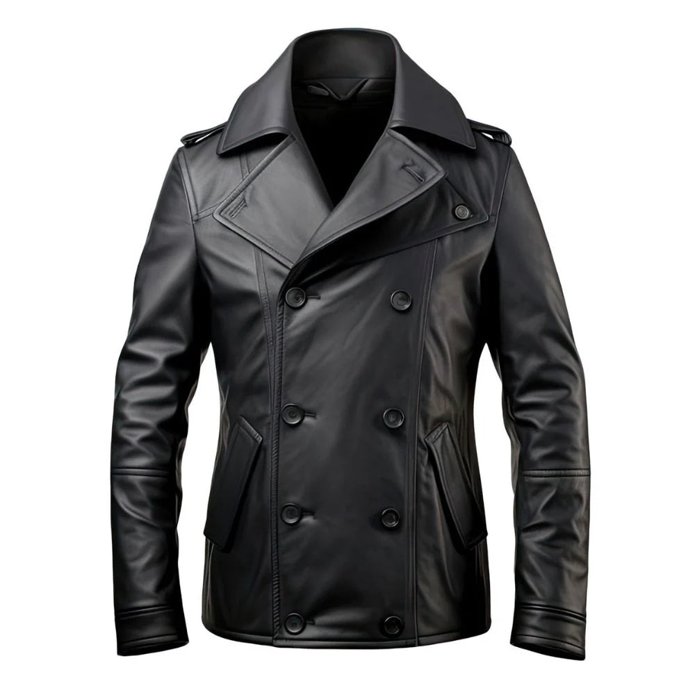 A classic garment that radiates sophistication and style is this elegant black leather pea coat. The classic pea coat style, which features welt pockets, a notched collar, and a double-breasted front, adds a dash of vintage appeal. Made from genuine cowhide leather of the highest caliber, the men's double-breasted pea coat strikes the ideal mix between robustness and style, ensuring longevity and a luxurious feel.