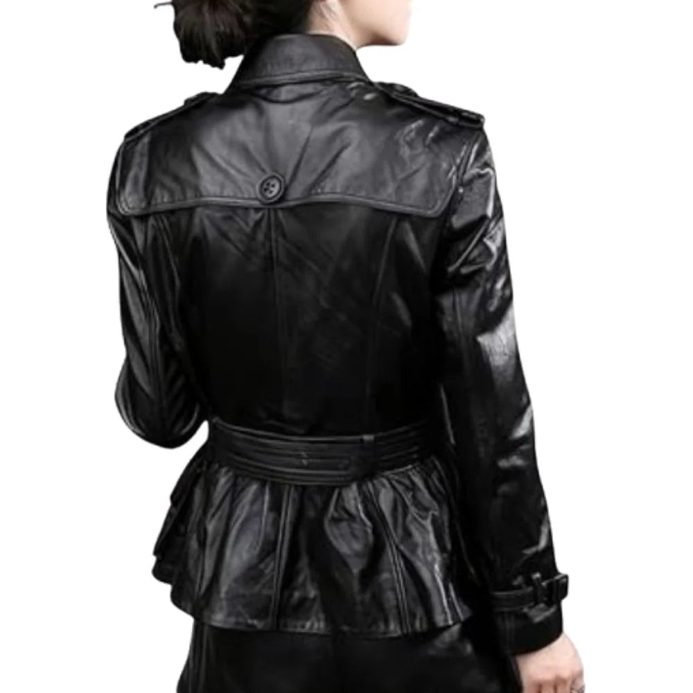 Presenting the Women's Slim Fit Belted Korean Fashion Casual Leather Jacket, which features double-breasted accents and is made of black genuine sheepskin leather. With its double-breasted button closure and waist and cuff belts, it embraces Korean design tradition and guarantees the ideal slim fit. The stylish shoulder epaulets add a dash of military flair and a timeless refinement to the entire ensemble. In addition to enhancing its attractive style, functional waist pockets aid in providing a secure storage area. For those seeking a sophisticated look, this multipurpose sheepskin leather jacket is a fantastic accent.