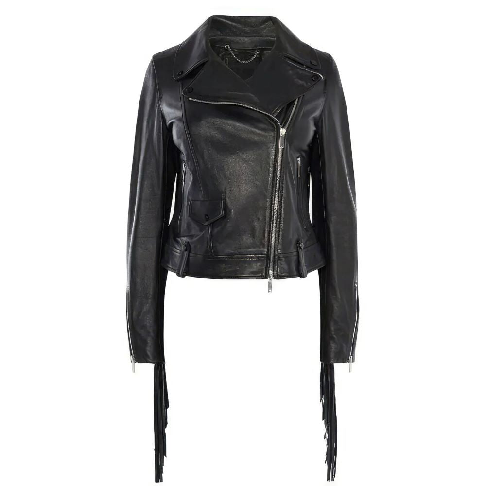 stunning classic black sheepskin leather jacket with a silhouette reminiscent of a vintage biker. The jacket has a classic elegance because of its asymmetric zipper fastening and notched lapel collar; it also has a modern eye-catching fringe cutting on the sleeves and hem, which make it more beautiful. This jacket has an impressive design and is made with high-quality leather, which can be paired with other fits to suit various occasions . Whether worn with tailored slacks or jeans and a t-shirt for a more laid-back look, this jacket will make any outfit look nicer and better and is also a perfect addition to your wardrobe. For formal and semi-formal occasions, it works wonderfully. The excellent feature of this jacket is, however, the fringe detailing on the sleeves and hem, which is adding a touch of bohemian charm and elegance.