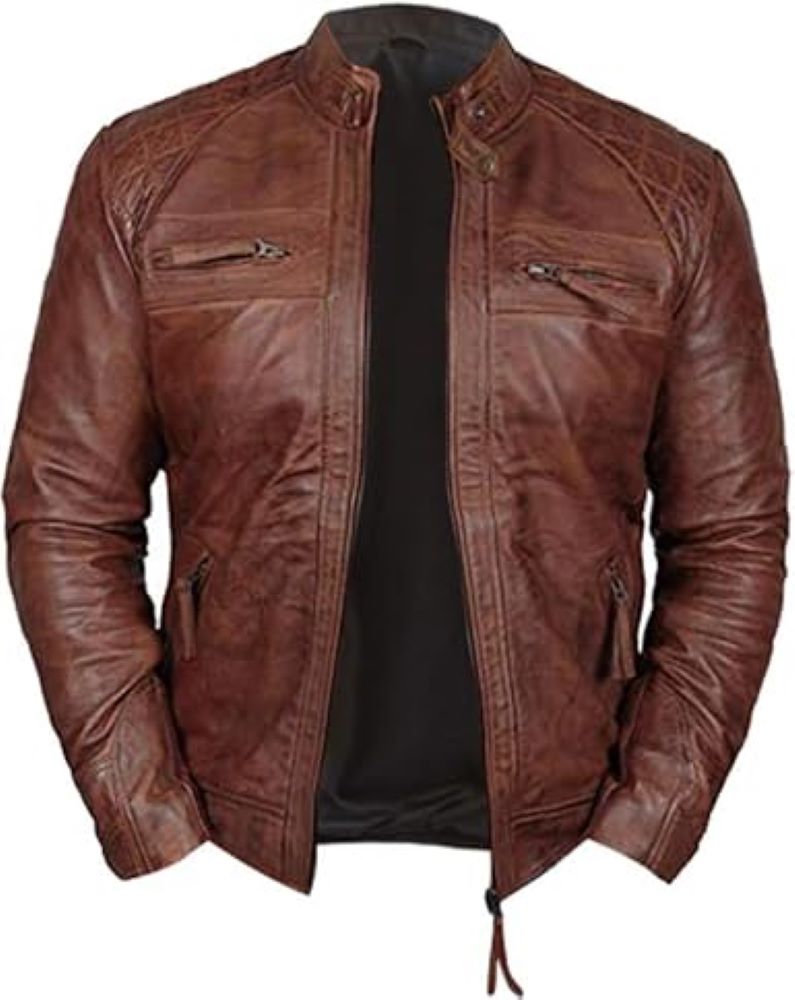 This distressed brown cafe racer brando Biker jacket, which is beautifully designed using Premium sheepskin leather and is expertly crafted with high-quality materials, will last for many years without sacrificing style. It featured with snap-tab collar and two zippered pockets for keeping valuable things . A front zipper closure for easy wearing. It is perfect for both casual weekend outings and night outs.