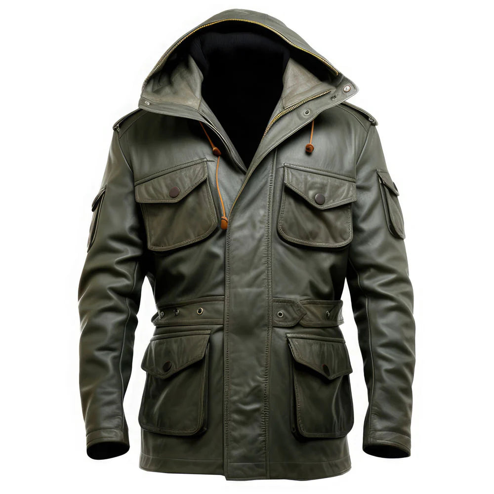 This image is an interpretation of the iconic M-1965 field coat, which is constructed of opulent leather and combines tough functionality with sophisticated elegance. Because military-style coats are made of high-quality leather, they radiate refinement and endurance. This M-1965 field jacket's adaptable collar is one of its intriguing features. The detachable hood enables a type of weather adaption. The jacket assumes a traditional Mandarin collar without the hood. On chilly days, the button shut keeps the throat cozy and toasty. This jacket's body is decorated with several pockets, providing ample room to store everything. To make it easy to access necessities while on the road, two sizable chest pockets are fastened with button closures. The bottom half has four pockets, with two of them buttoned in addition to two simple hand pockets covered with a flap. There is also a drawstring at the waist for tailoring the form to one's preference. The added buttoned storm flap can be seen for protection from the weather.