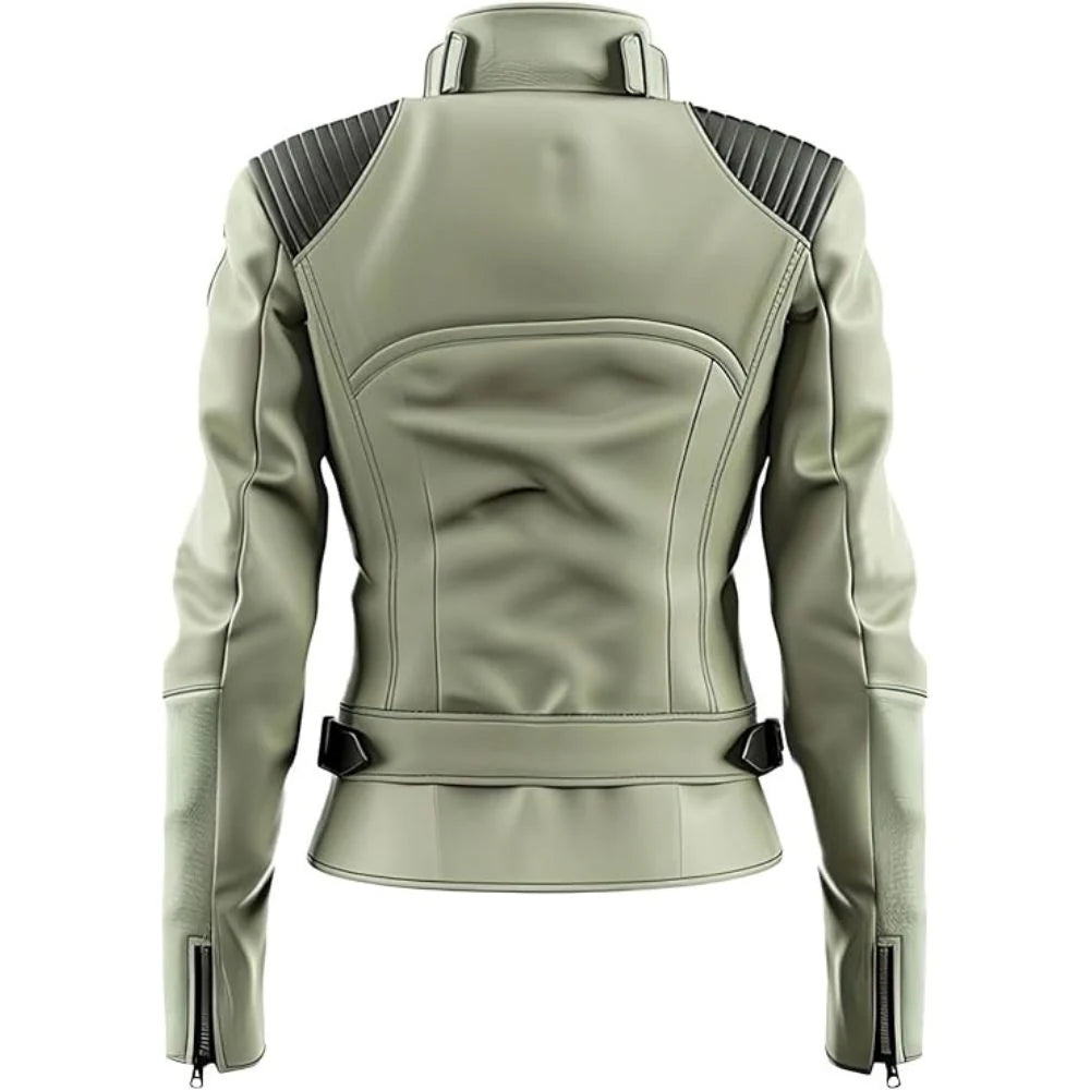 The finest quality genuine sheepskin leather is used to create this eye-catching women's sage green leather motorbike jacket. For individuals who wish to stand out, this authentic women's biker leather jacket provides a fashionable and long-lasting choice without sacrificing comfort. The dark grey contrast with the sage green color of the jacket provides a sense of sophistication and versatility. It is simple to put on and take off thanks to the strong zipper fastening.