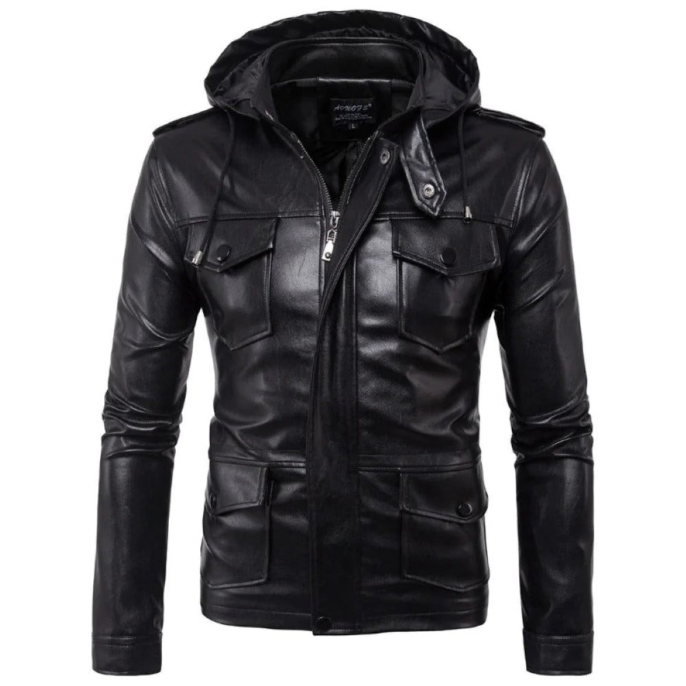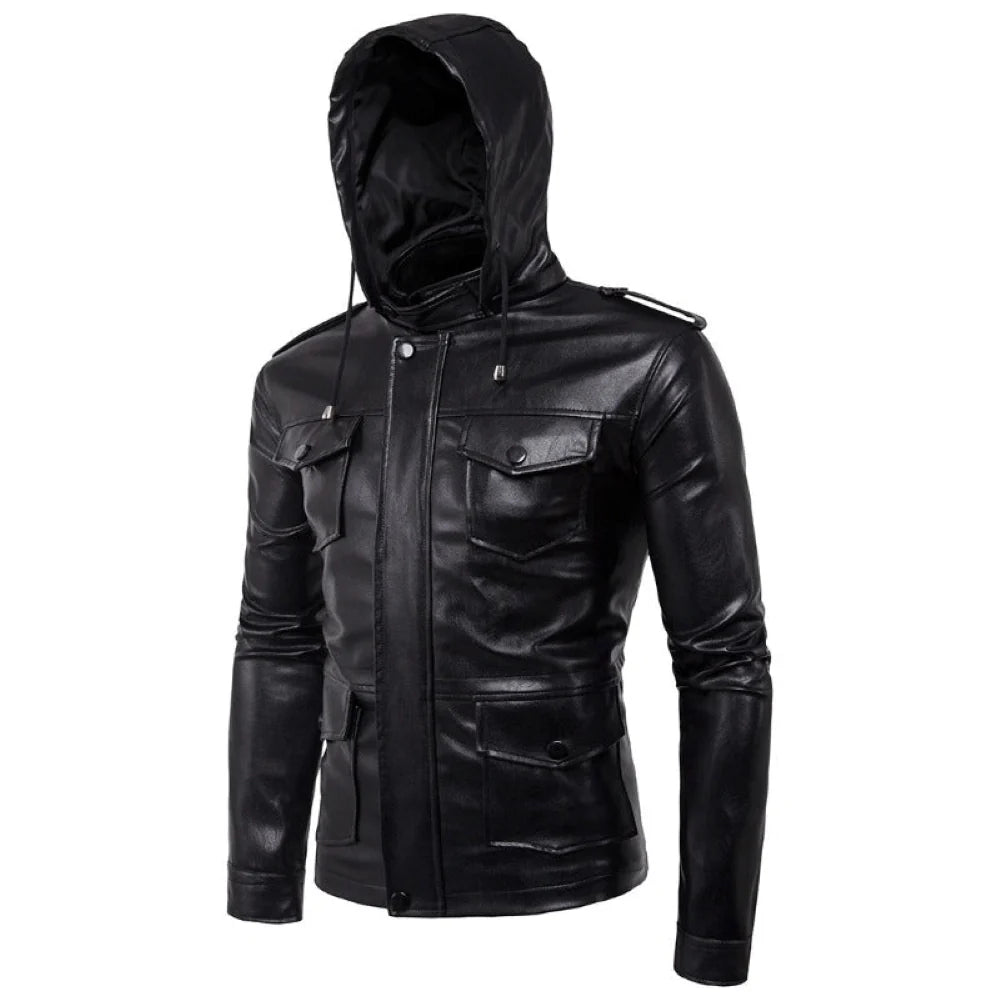 The Black hooded shape of this elegant lambskin leather jacket gives extra warmth and weather protection. The jacket's several pockets and flap fastenings give it a rugged and useful appearance. The front zipper gives a little of edge, and the Tailored fit hem and cuffs provide comfort. This jacket feels luxurious and is long-lasting because it is constructed of high-quality leather. Whether you're riding a motorcycle or simply want to dress up your regular clothing, this black leather gear is a must-have.
