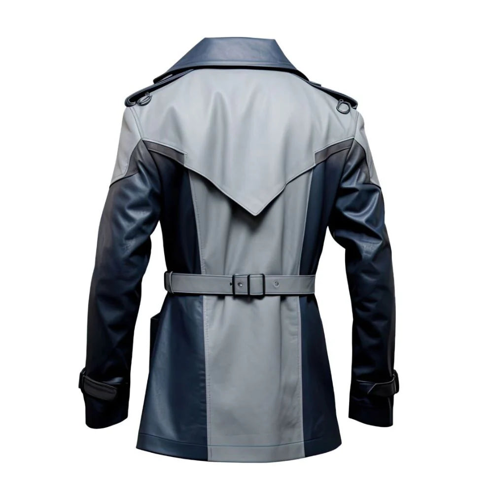 This men's trench coat in blue and grey is a true fusion of contemporary and vintage styles. Because it is made of high-quality sheepskin leather, it is warm and cozy to wear. The buttonholes' decorative buckles give them a timeless look. The wearer gets a stylish fit thanks to the double-breasted crossover buttons and belted waist. The traditional warm front features two flap pockets and a buttoned collar with a notch. The silhouette is slimmed by a belted waist. For both professional and casual settings, this trench coat is ideal and adaptable. The coat will survive for many years if it is made using high-quality materials and expert craftsmanship.
