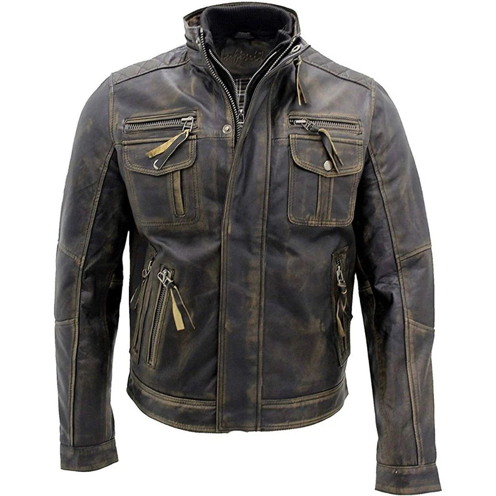 This vintage distressed brando leather motorcycle jacket has a timeless elegance, and the design aspect gives the entire ensemble sophistication and adaptability. Because it is constructed of real leather, it has a worn-in appearance and a comfortable, character-enhancing distressed finish. The jacket features several pockets, a stand-up collar, and a sleek, modern design. You'll appear current and casually stylish.