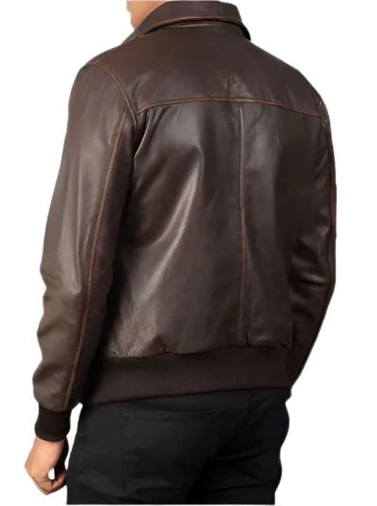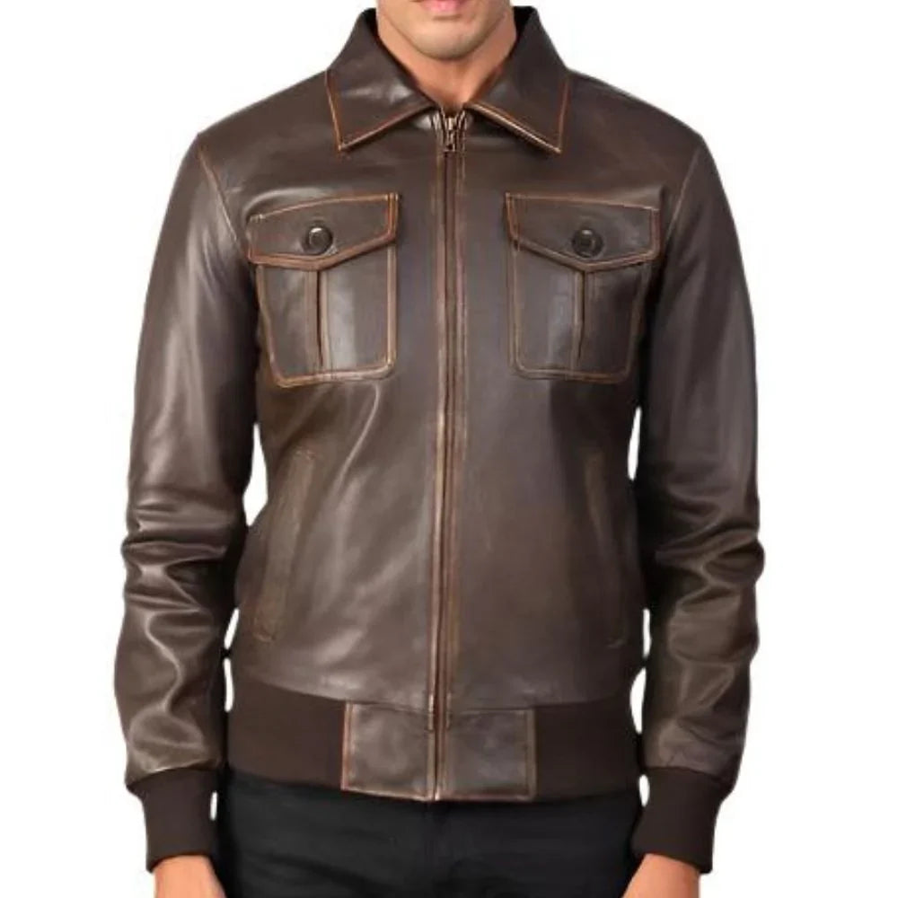 This brown leather bomber cowhide jacket is a timeless and versatile piece that is made of high-quality leather for a luxurious feel and long-lasting durability. Its timeless design features a tight-fitting ribbed collar, cuffs, and waistline. The front zipper fastening not only provides warmth but also has an elegant appearance. This jacket adds a touch of refinement to any ensemble, regardless of what you're wearing.