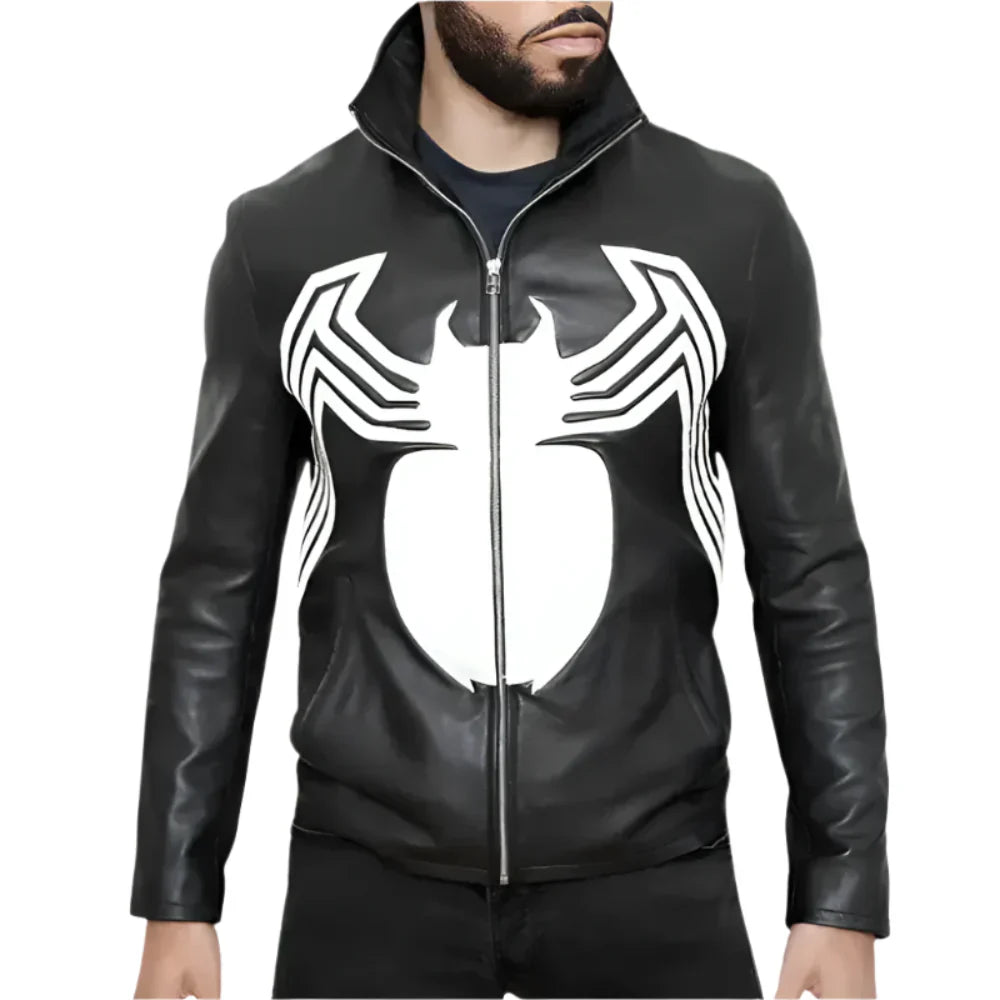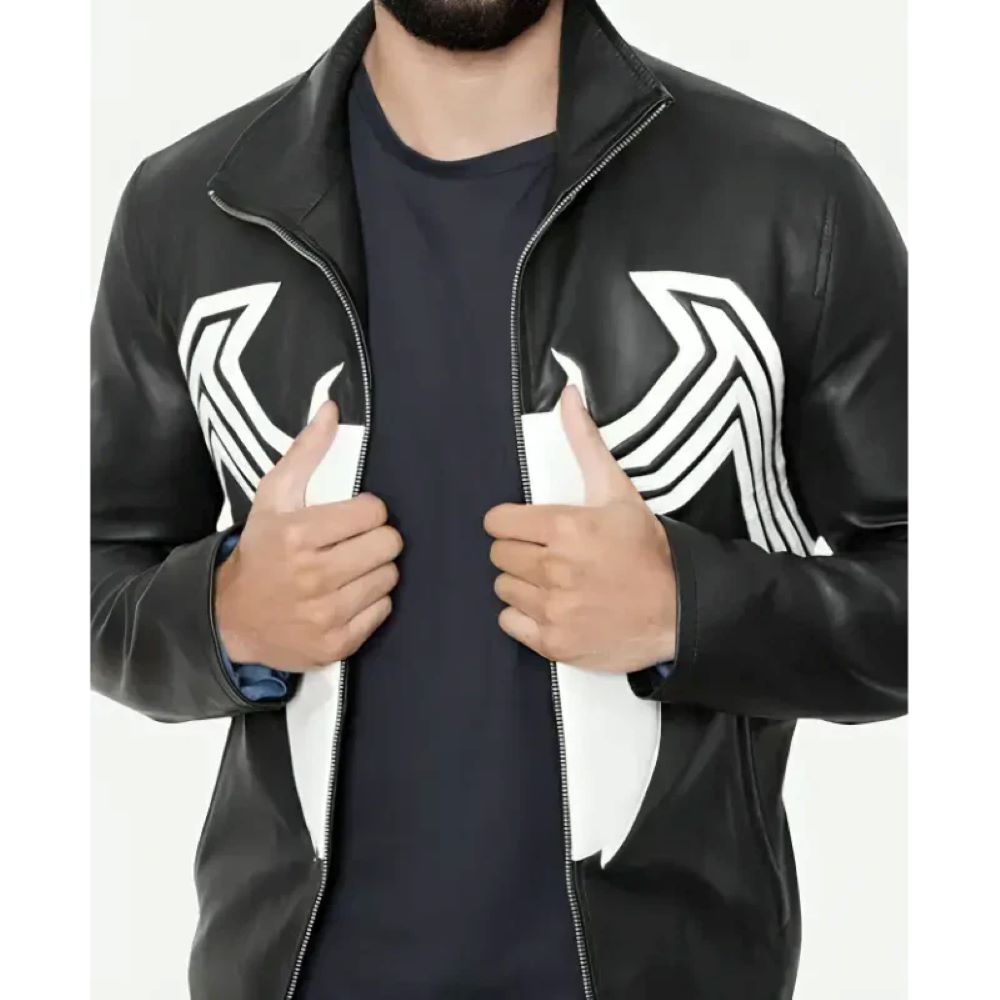 This black, full-sleeved Venom The Last Dance Leather Jacket is expertly crafted from real or vegan leather, inspired by the movie and worn by Tom Hardy himself. It features a soft lining, fine stitching, and a white spider logo along with open hem cuffs, all contributing to its authentic look.